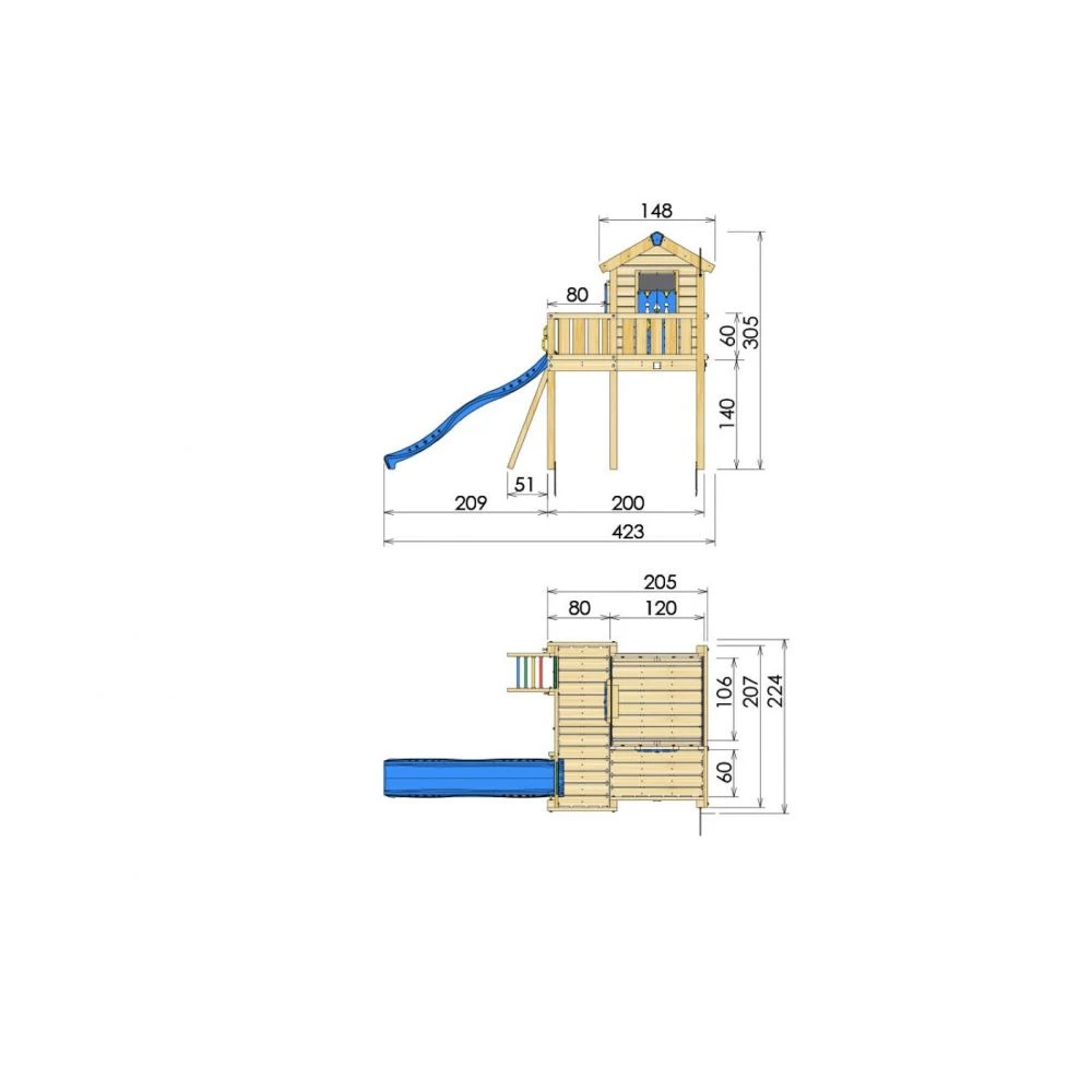 Playhouse XL er ideel til en større have, eftersom det har masser af legeplads. Udover smart sikkerhedsudstyr som pecielle hjørnepuder giver Jungle Playhouse XL også mulighed for masser af aktiviteter og er den sidste byggesten i den enestående ‘Grow with me!’ – proces. Tegn eller kommuniker på tavlen eller nyd den smukke udsigt fra den hævede veranda. Jungle Playhouse XL er lidt kortere end Jungle Palace, men udgør med sine overvældende 220×275 cm på platformen det perfekte legetårn med legehus i træ. Jungle Playhouse XL kan med fordel udbygges med et Climb eller Swing modul Xtra, som kan tilføje helt nye dimensioner hvad angår klatring og sus i maven.