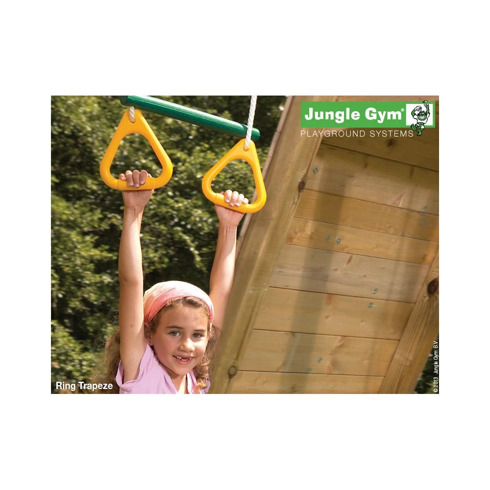 Sjov grøn og gul trapez gynge til alle små cirkusartister. Børnene kan enten hænge i de dråbeformet håndgreb som giver maksimal stabilitet eller i barren i mellem dem. God Jungle Gym gynge til at udvikle styrken og motorikken i armene.