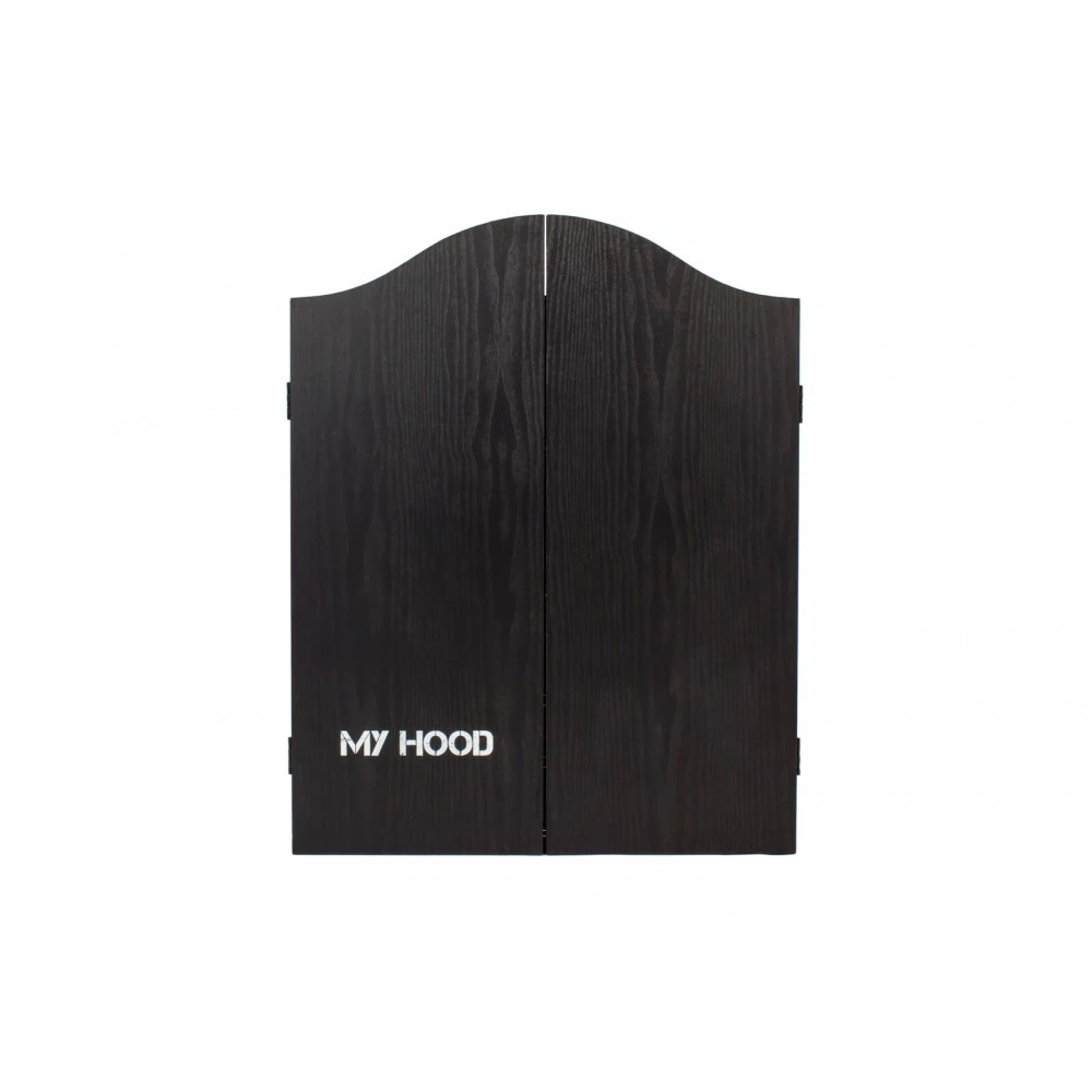 Komplet sæt med dartskive, 6 pile og kabinet i en flot sort finish.