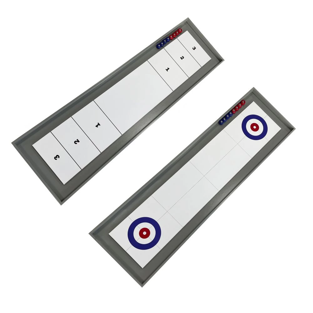 Spillepladen er vendbar og har det populære shuffleboard på den ene side og curling på den anden.