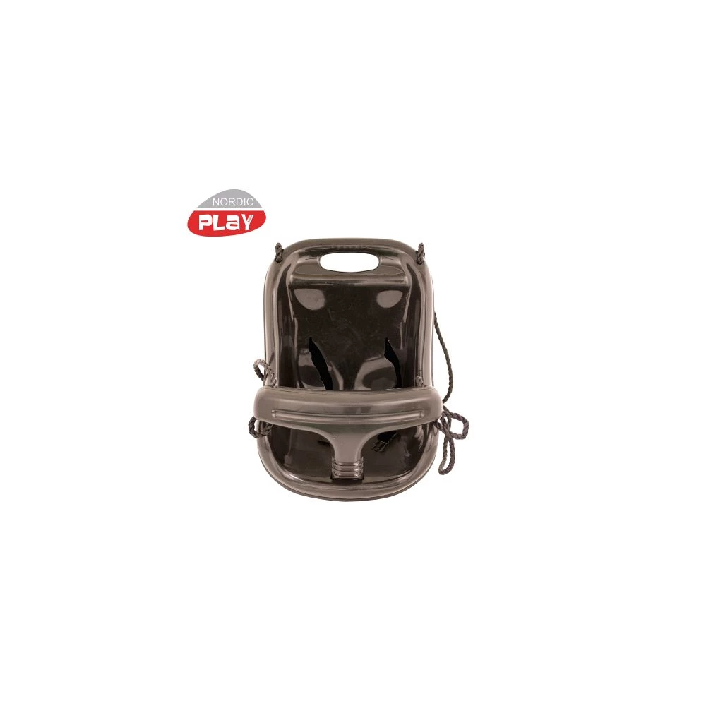 NORDIC PLAY Babygynge fremstillet i sort plast og er inklusiv justerbart sort reb med ophængt i galvaniseret runde ringe, eksklusiv gyngekrog. Gyngen har høj ryg for ekstra komfort og er inkl. sele for optimal sikkerhed.