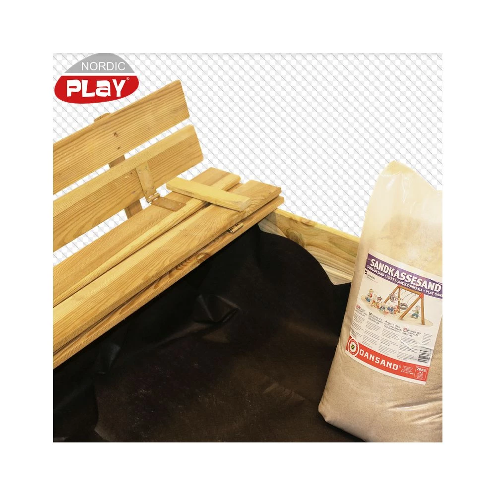 Ukrudt fjernes fra stedet, hvor sandkassen skal opstilles. Placer sandkassen og læg dugen i sandkassen. Sørg for at dugen går godt op ad siderne på sandkassen. Hæft eventuelt dugen med en klammepistol. Fyld sand i sandkassen, nu er der klar til leg.
