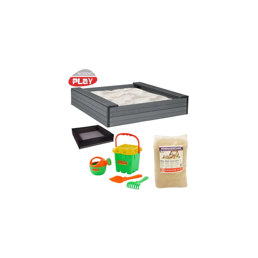 Nordic Play Sandkasse med sæde 24 x 120 x 120 cm WPC inkl. net, 240 kg sand og grønt strandsæt