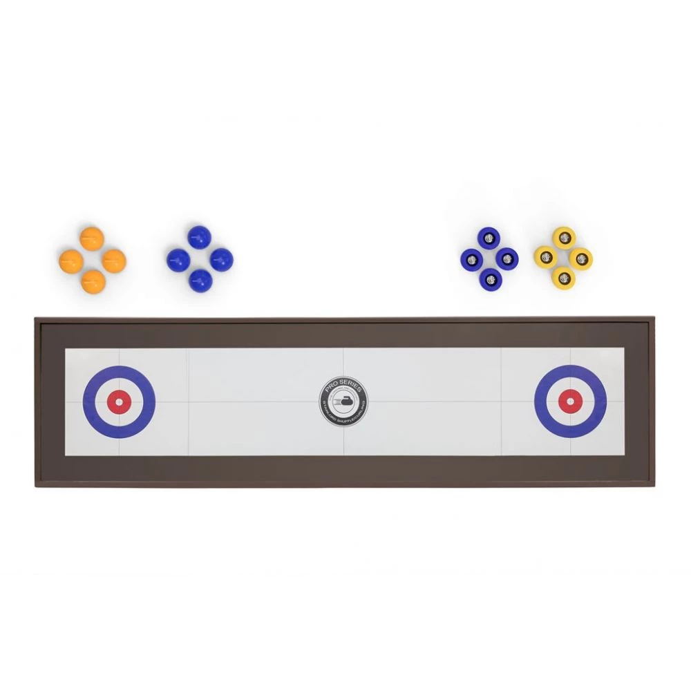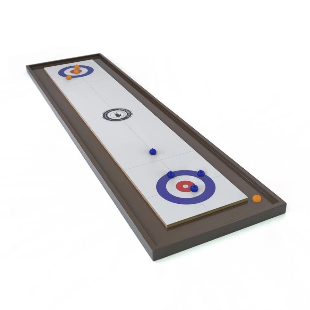 Spillepladen er vendbar og har det populære Shuffleboard på den ene side og Curling på den anden side.