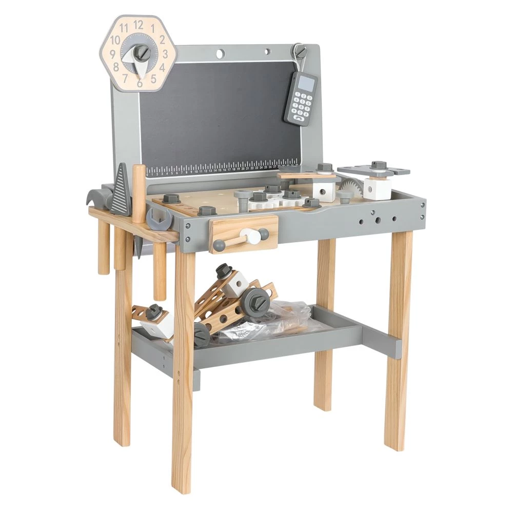 Se den lille gør-det-selv håndværker udfolde sig med denne lækre værkstedsbænk udført i FSC 100% FSC® certificeret bæredygtigt træ. Med værkstedsbænken er det kun fantasien der sætter grænser for, hvad der skal samles og repareres i værkstedet idag. Inkl. ur, arbejdstelefon, hammer, skruetrækker, spartel, fastnøgle, arbejdstavle, høvlebænk, rundsav, poser med konstruktionslegetøj med skruer, møtrikker og tandhjul. Med god hyldeplads til dit barns øvrige legetøj og arbejdsredskaber.